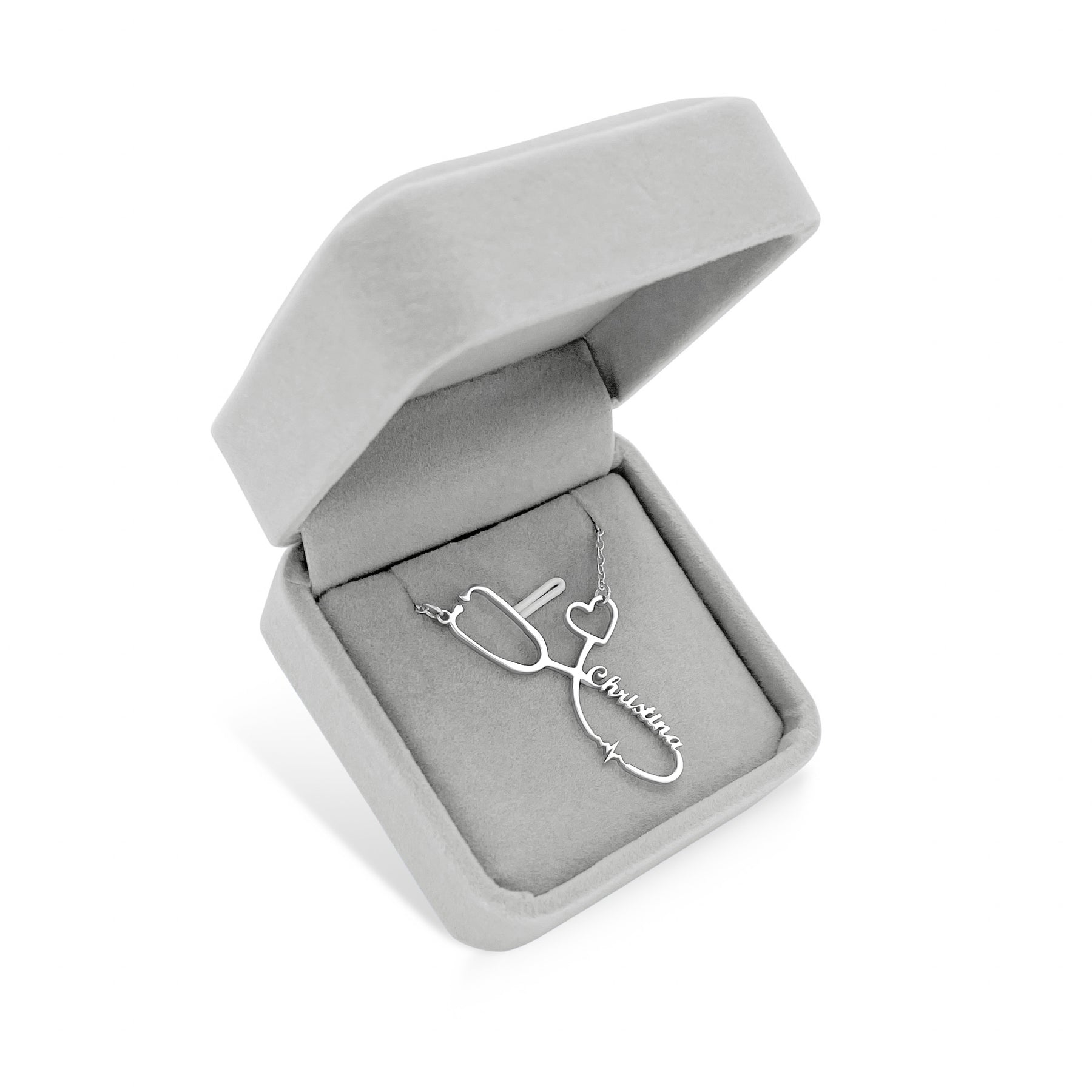 The Personalized Stethoscope Necklace features a stethoscope, the name of your favorite medical professional and a heart at the end, symbolizing the love they have for helping others.